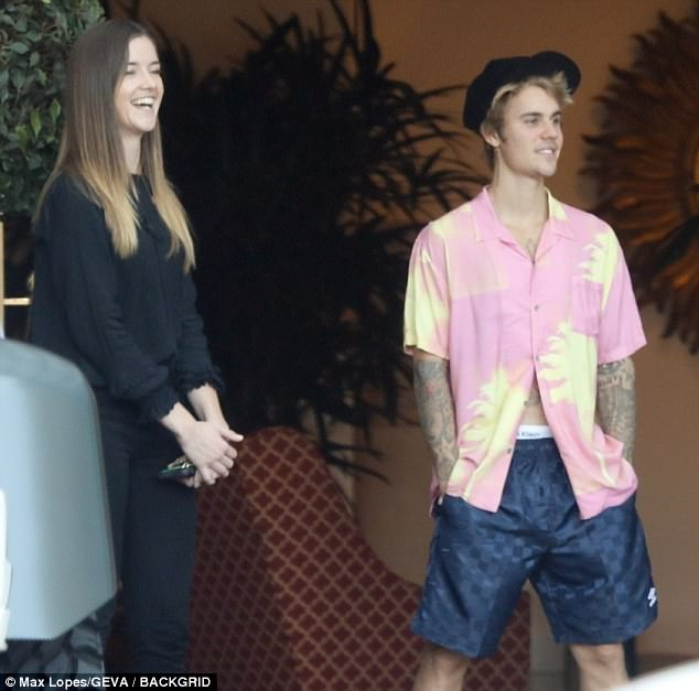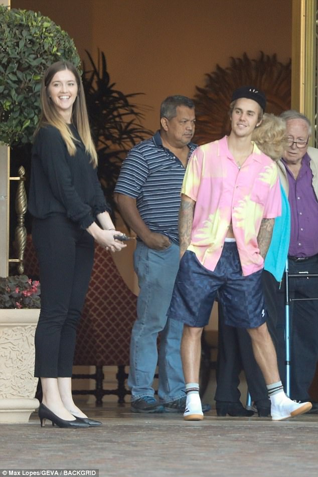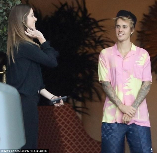 ▼穿著粉色花襯衫的小賈斯汀,將下半部的襯衫鈕釦任意解開,展現他性感偶像的瀟灑姿態,而穿著一身黑的長髮女孩則是與小賈斯汀有說有笑,不過已經重新與賽琳娜復合的小賈斯汀跟過往的表現已經有所不同,過去總是很快就能夠與漂亮美女調情、每到巡演之處都要找當地美女開趴的小賈,刻意在聊天時保持兩步以上的禮貌距離,以防被誤會。