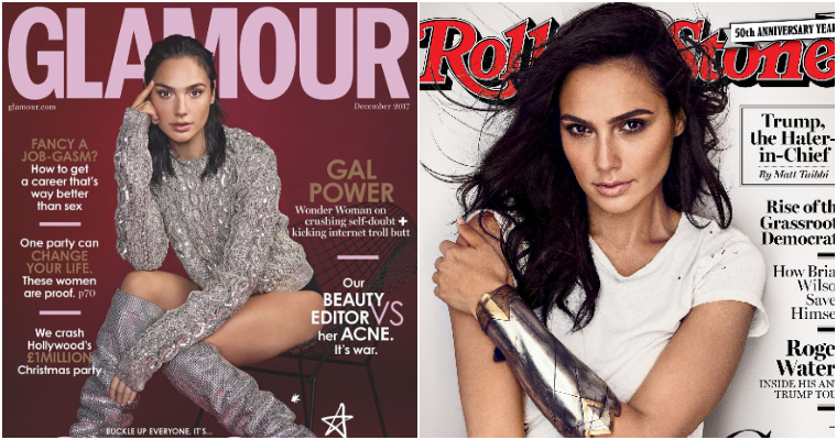 演出《神力女超人》( Wonder Woman ) 後以健康、性感又正面的形象成為許多影迷心中的「國民老婆」,蓋兒加朵的魅力除了在影壇發燒,也席捲了各大雜誌封面,除了以女性客群為主的英國雜誌《Glamour》,也以單人身份登上了美國相當具有權威性的《滾石雜誌》封面,成為了 2017 年最勢不可擋的女演員,除此之外,在今年以男性時尚為主的雜誌《GQ》所公布的最新封面照中,蓋兒加朵更被提名為「年度風雲人物」,成為入圍者中唯一一名女性。
