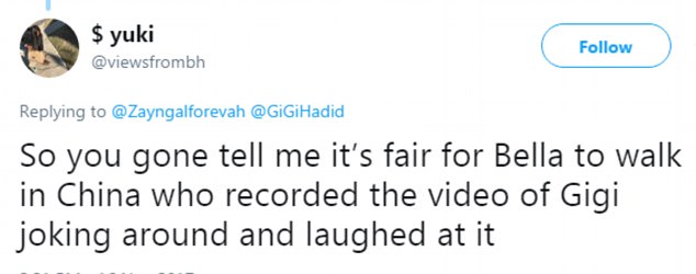 吉吉哈蒂德在推特上主動表示,自己在上海維密召開之前,已經確定被中國封殺而無法如期前往走秀:「我犯下了錯誤,導致我今年無法前往中國完成活動,愛著我的維密大家庭和激勵人心的女孩們!我也迫不及待能夠跟大家一起欣賞這一次的大秀,我知道它永遠會是如此精彩,我也迫不及待明年的參與。」