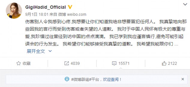 ▼由於大量中國網友的抗議舉動,甚至到維密官方帳號不停洗板,最終讓吉吉哈蒂德在 9 月 1 日透過她大陸微博的官方帳號發表中英文聲明,表態自己以後會謹言慎行,不再做出會引起種族歧視紛爭的舉動。不過許多中國網友依然不買帳,認為吉吉哈蒂德故意不同步發表於她的 IG、推特國際帳號,根本是「大街上罵人,小巷裡道歉」。