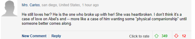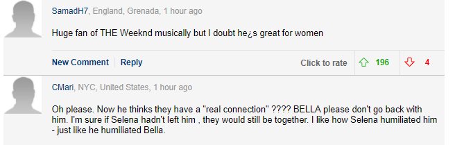 事實上貝拉哈蒂德在前陣子才傳出與另一位加拿大說唱歌手 Drake 曖昧中,還傳出威肯因此醋勁大發,要他們在多倫多共通的好友選邊站,不過當威肯試圖重新追求貝拉的消息傳開後,國外網友普遍都對威肯的追求復合舉動感到不諒解,認為當初是他主動向貝拉提分手,同時貝拉還因此度過了情傷的低潮期,現在威肯的行為被網友批評是把貝拉當作替代品。