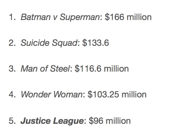 ▼除了是 DC 擴展宇宙中首週票房最低的以外,和最成功的《蝙蝠俠對超人》( Batman v Superman: Dawn of Justice ) 比起來相差了 740 萬美金,更遠不及《富比世》、《BoxOffice》媒體所預測的 1.5 億美金,慘烈的票房也使華納兄弟、DC 大受打擊。