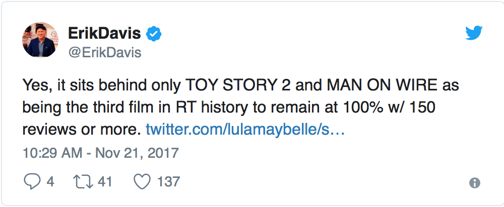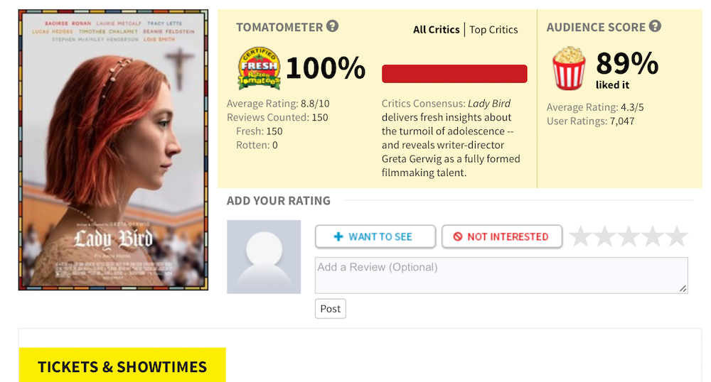 雖然不比真正專業的影評網,要在「爛番茄」上獲取高分也並不容易,直到昨天仍只有《玩具總動員2》( Toy Story 2 )、《偷天鋼索人》( Man on Wire ) 2 部電影獲得 100% 新鮮度的「爛番茄」,在今天終於又有新成員加入了,那便是由《紐約哈哈哈》( Frances Ha ) 、《第一夫人的秘密》( Jackie ) 的葛莉塔葛薇 ( Greta Gerwig ) 作為導演的出道作品《Lady Bird》,於「爛番茄影評網」上獲得了大大的 100% 好評。