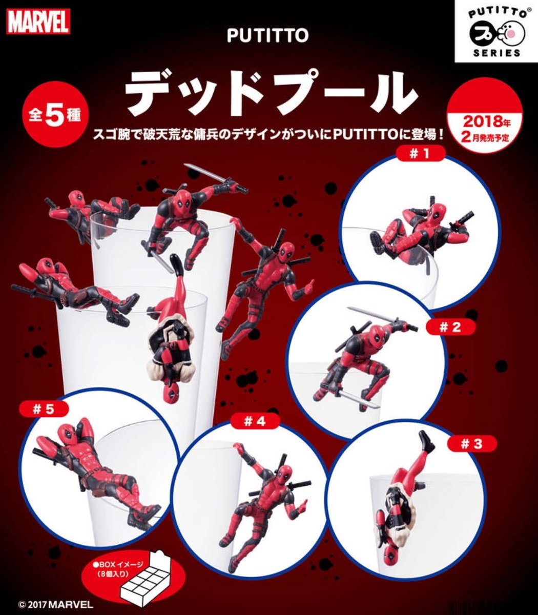Puttito 與漫威將死侍化身成為日本最火紅的杯緣子系列,彈跳力和攀附力都相當高超的死侍,在杯子邊緣上被創作出許多經典的帥氣姿勢,這一組系列包含了死侍 5 個動作,包含單手支撐、另外一手比讚的豪氣姿勢,同時也有女僕誘惑的搞笑版本。