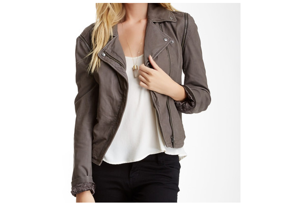 ▼ LINE 外套:帥氣俐落的灰色機車皮衣,此款美金定價 349 元,台幣約 1 萬 500 元。