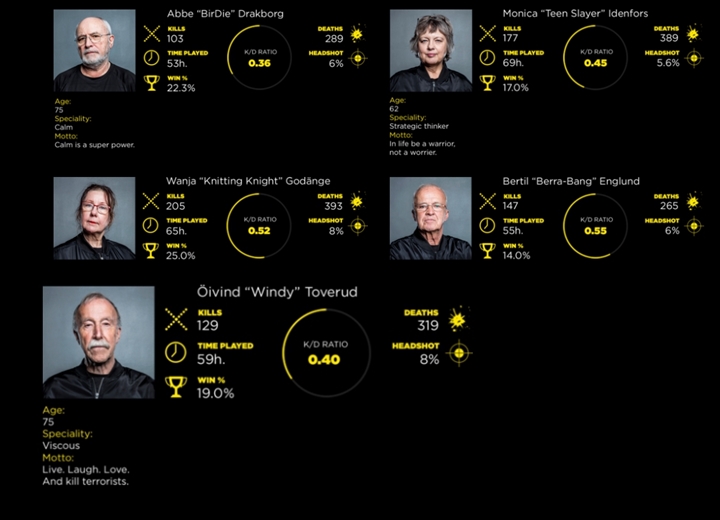 銀色狙擊手裡的成員包括三男兩女,最年輕是 62 歲 ID 稱號是青年殺手的 Monica,最年長的則是 81 歲的 Bertil ID 為 Berra-Bang,另外還有像編織騎士、小鳥、小旋風也都是相當年長的選手。此外,該隊伍的教練是 CS 時代傳奇戰隊 Ninjas in Pyjamas(NiP)的團隊成員兼創始人 Potti 來擔任。接著我們來看一下銀色狙擊手的練習畫面,雖然內容皆為瑞語,但透過練習的畫面還是可以感受到這群爺爺奶奶的氣勢一點也不輸年輕人。