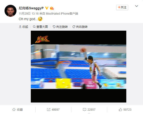什麼「東方翔」、「元大鷹」、「藍蝶滑雲遊身步」,還有最經典的「亢龍不悔旋風式灌籃」,雖然名稱真的有夠中二,但相信在當時大家看到這些一定興奮不已吧。這部在 2008 年堆出的偶像劇,歷經將近 10 年後,就在昨日下午,現役 NBA 金州勇士隊球員 Nick Young 突然在個人微博上張貼了一部影片,就是當時劇中角色「無極尊」施展傳說中「亢龍不悔旋風式灌籃」的片段,並在貼文敘述中打上「Oh my god...」的字樣,可以看的出來 Nick Young 完全被這幕給嚇傻了。
