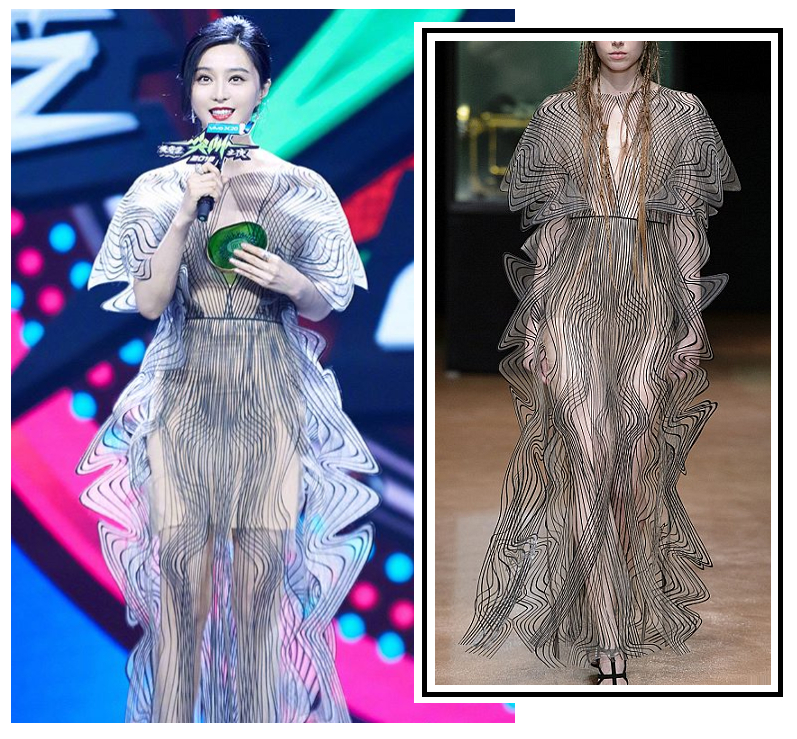 ▼向來以前衛實驗風格聞名的荷蘭女設計師 Iris van Herpen,融合「3D 列印」、「射出成型」(Injection moulding)等高科技打造出舉世不凡的作品,深受天后 Lady Gaga 的青睞;而范冰冰穿起來則讓人有一種「雲裳羽衣」「仙氣繚繞」的流動美感,如同仙女下凡一般。