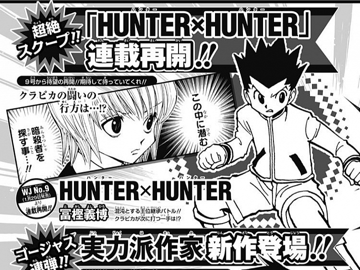 早在今年 9 月冨堅義博宣布《獵人》再度休刊時,不少網友認為下次復刊應該是好幾年後的事了,殊不知在 11 月底時突然來個「閃電復刊」的消息,讓不少網友大吃一驚,原來是要配合《Jump》50 周年,因此選定 12 月 11 日恢復連載,甚至還謠傳會有特別的計畫,富堅老師在當時還堅稱自己在 2017 年結束前一定會再度復活,殊不知在昨日的《Jump》周刊中卻嚴重打臉,恢復連載的正式日期改為明年的 1 月 29 日,不少漫迷們雖然有些小失落,但幸好還是有值得開心的部分。