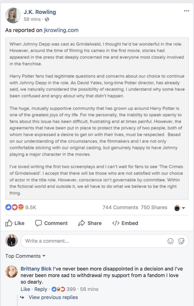 原來是因為去年與小 23 歲的年輕前妻安珀赫德(Amber Heard)離婚時,發生了家暴疑雲,讓不少網友對 J.K.羅琳提出質疑:「《怪獸與牠們的產地》是在描述要對抗權力的濫用,但你們卻採用了一個施暴者當作演員卡司?」面對書迷的批評聲浪,現在作者 JK 羅琳終於對外正式回應。