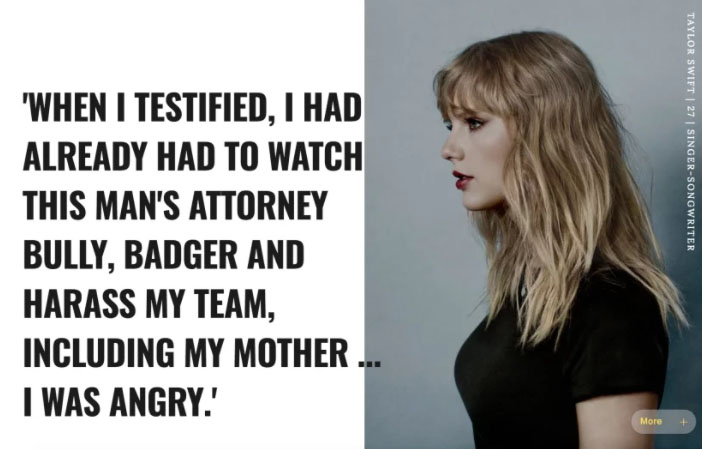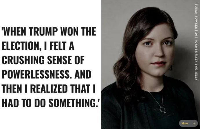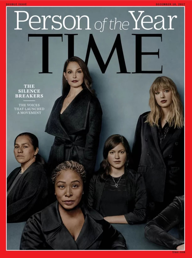 相當知名的時代雜誌《TIME》,本期封面以目前好萊塢以及娛樂圈最大的新聞,也就是性騷擾醜聞為題,請到了多位名人一同拍攝封面展現反性騷擾的決心,其中可以看到西洋小天后泰勒絲(TaylorSwift)、前 Uber 工程師蘇珊·福勒(Susan Fowler),宣揚她們打破沉默「The Silence Breakers」,為這件事情發聲。