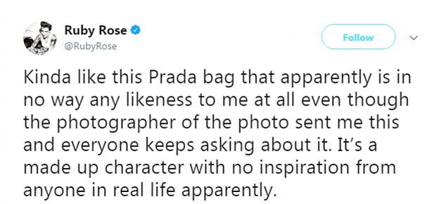 ▼對於 Prada 包包上的圖案只是虛構人物,不是參考她的髮型和長相的言論,Ruby Rose 忍不住酸了回去:「很明顯我是一個超級大眾臉,沒多大的事。」