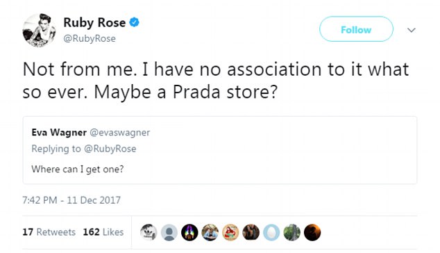 ▼Ruby Rose 不滿於 Prada 使用她的外型做為設計靈感,卻沒有事先進行任何接洽和詢問,讓她忍不住想在推特上把這件事情攤開來說,並刻意回覆一位想要購買的網友來酸說:「我這裡買不到,我根本沒有跟他們合作,也是在 Prada 店裡買得到?」