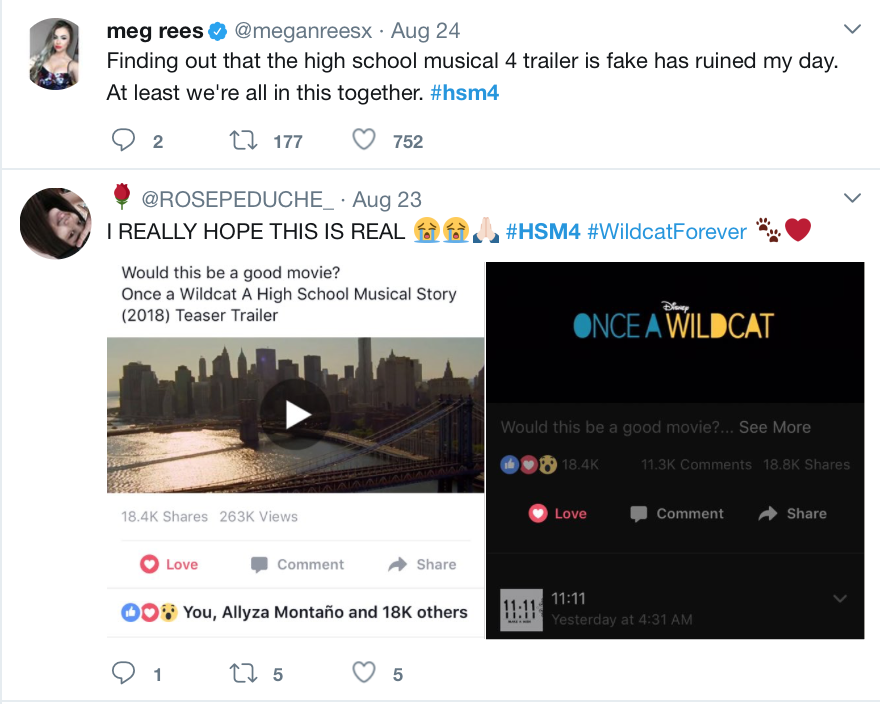 這支影片在上傳沒多久後,便受到網友們廣大迴響及轉發,就連艾希莉絲黛爾本人也將影片轉發,不過粉絲們先別太激動,因為這支影片是由粉絲製作,他集結了這幾年凡妮莎、柴克、艾希利等人在過去 10 年的參與作品,並剪接成《High School Musical 4 - Once A WILDCAT》放在網路上。