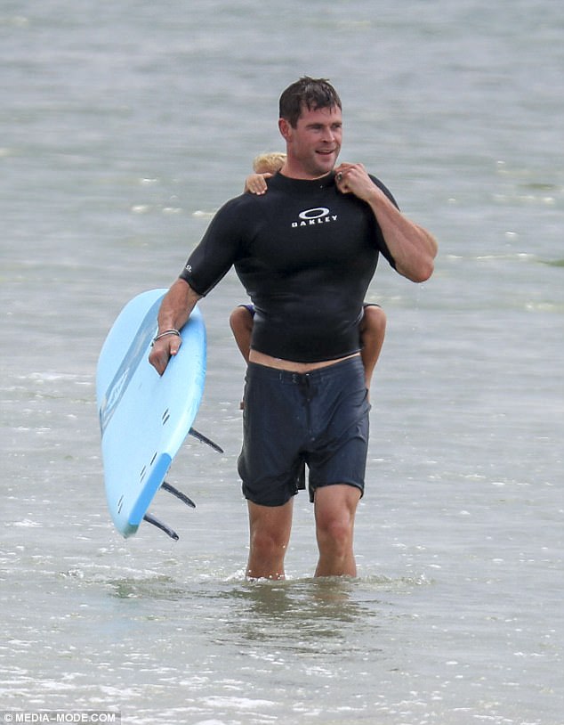 ▼克里斯·漢斯沃最常前往澳洲拜倫灣衝浪,當他讓小兒子抓著自己的背,到海裡體驗衝浪、滑水快感時,克里斯·漢斯沃濕透的衝浪衣讓他的身材線條更明顯、也更加性感。
