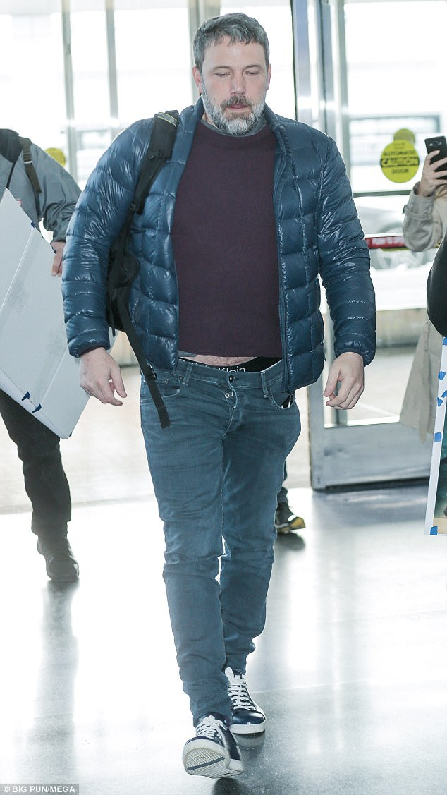 ▼班艾佛列克這周三現身紐約時,也被網友指出身材已經完全偏離了超級英雄。可以看見穿著防寒的羽絨外套的班艾佛列克,裡面的上衣被撐脹到微微露出了內褲和肚子,同時神情看起來相當疲憊。