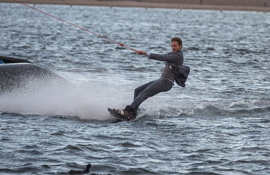 ▼熱愛西服的他也在前往各地旅遊的過程當中,穿上西服與戶外的景緻合照,就連衝浪也要穿上西裝。
