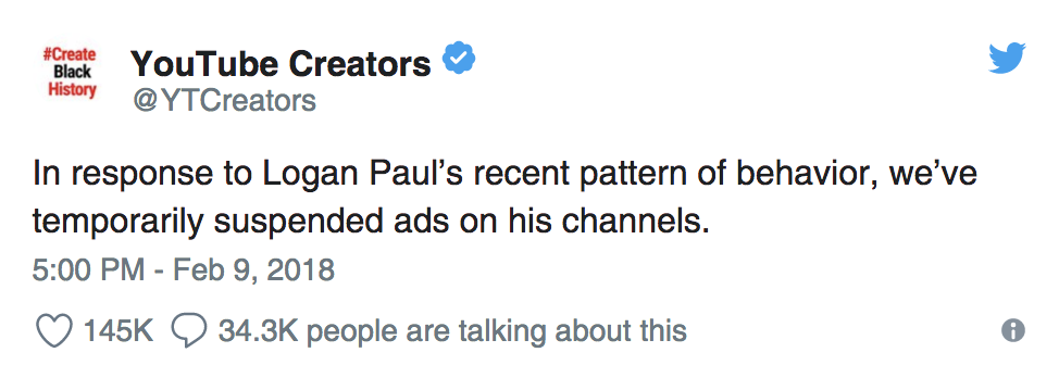 ▼YouTube 這邊也表示:「經過深思熟慮之後我們決定暫時停止在 Logan Paul 的 YouTube 頻道上投放廣告。因為他的行為,不僅不適合廣告商,更是對許多觀眾造成不良影響。」
