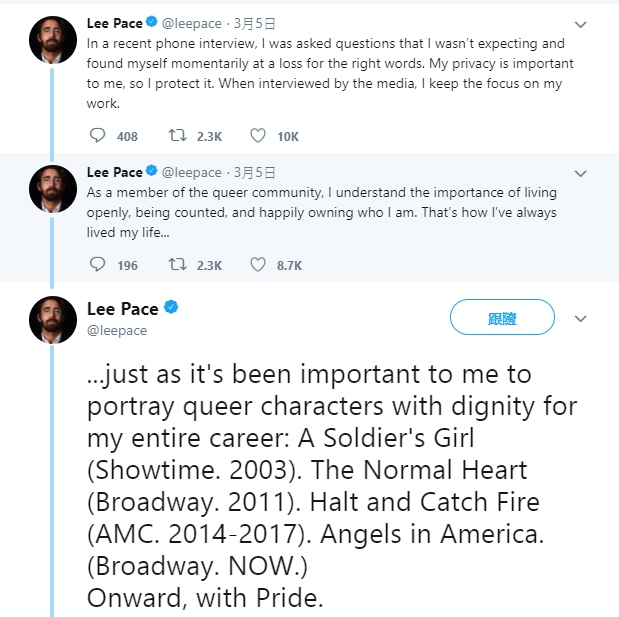 李佩斯也特別提到他在《士兵的女孩》(Soldier's Girl)演出的跨性別者、百老匯同志劇《The Normal Heart》、《天使在美國》(Angels in America)和《奔騰年代》(Halt and Catch Fire)的 LGBT 角色,都是自己演員生涯中相當驕傲的影視形象,希望未來影迷能夠依然尊重與支持勇敢向大眾出櫃的李佩斯。