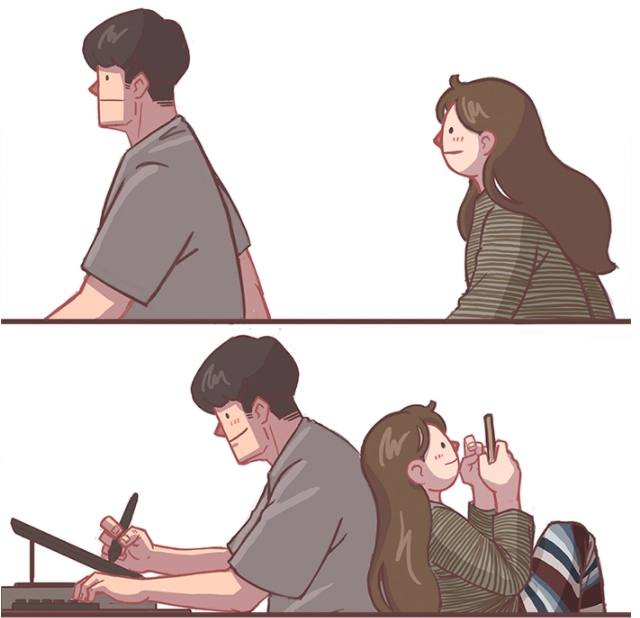 「男生走到哪就跟到哪的女友,居然連廁所都想要跟進來!」這一個引人發笑的情侶生活小趣事,事實上正是建立在韓國畫師 Kyu-Young Lee 的戀愛生活所繪製出來。Kyu-Young Lee 笑說:「沒錯!這就是關於我和女友的相處經驗。我們在 3 年前認識,在這個月才剛結婚,每一幅繪圖都是我們珍貴的故事。」