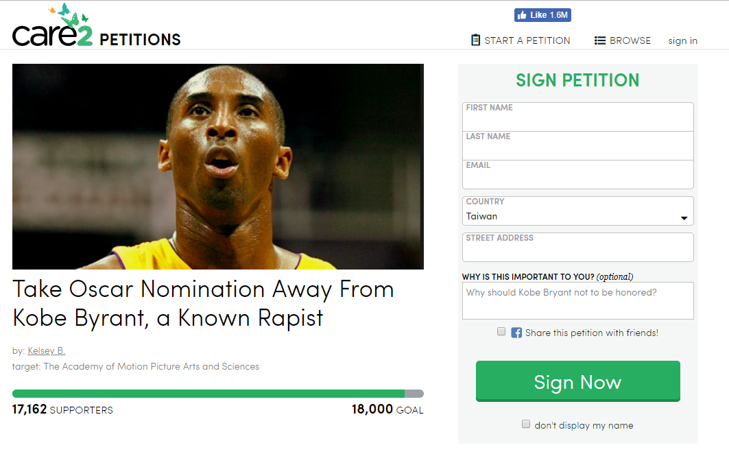 發起連署的民眾認為,既然 Woody Allen 與 James Franco 都因性騷擾一事而被撤銷出席奧斯卡的權利,那為何曾犯下性侵案的 Kobe Bryant 卻能繼續出席,甚至拿下獎項。目前已有超過 17000 名網友請願取消 Kobe Bryant 的奧斯卡獎,大家似乎都很不滿奧斯卡官方對 Kobe Bryant 的處理措施。