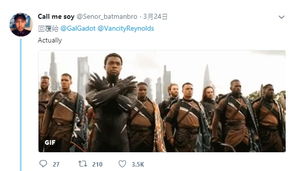 ▼許多網友都被蓋兒加朵和萊恩雷斯諾一來一回的互動給逗樂了,還有影迷提醒蓋兒加朵,別忘了漫威另外一位超級英雄黑豹也做出了同樣的手勢。