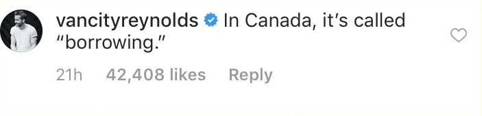 ▼在 Instagram上萊恩雷斯諾則額外說:「在加拿大,我們都把這個叫作借用。」