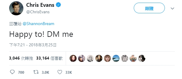 ▼香農·布萊姆這則貼文很快就在留言串中引來了許多漫威復仇者的超級英雄演員,像是「美國隊長」克里斯伊凡就留言說:「樂於做這件事,請私訊給我!」