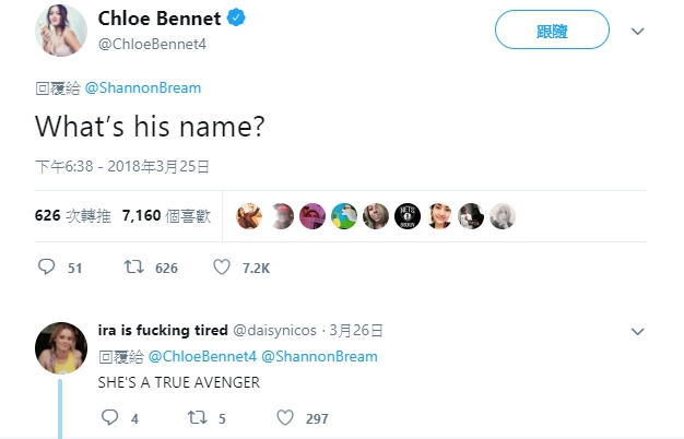 除了電影版的漫威超級英雄之外,在美劇《神盾局特工》(Agents of S.H.I.E.L.D.)當中飾演「絲凱」·的演員汪可盈也主動前來留言,令人看見這一些演員的暖心程度,對於這位小男孩來說,他們肯定也是真實世界的超級英雄。