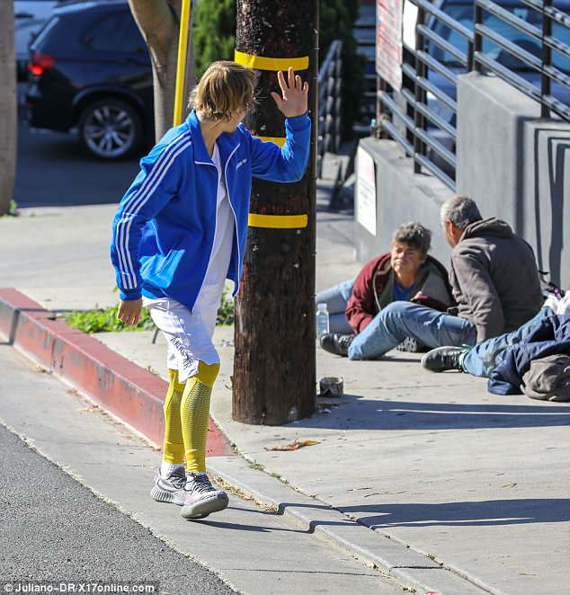 不過當小賈斯汀走在洛杉磯街道上,發現躺在人行道旁的流浪漢時,他除了主動為這些街友購買瓶裝水和食物之外,還神情自若地橫躺在街道上與街友聊天,他主要是與躺在下方的年邁女性街友閒聊問候。
