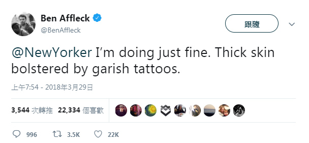 ▼班艾佛列克(Ben Affleck)也高 EQ 自嘲:「我現在挺好的,就是這個刺青讓我百毒不侵!」回應雜誌的針對言論。