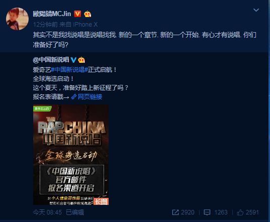▲ 歐陽靖也在自己的微博發表「其實不是說唱找我,是我找說唱」的貼文宣布加入《中國新說唱》