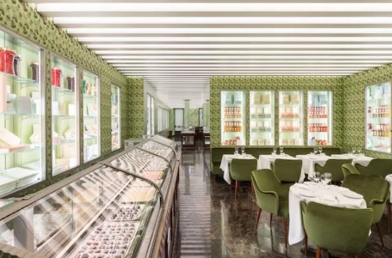 它坐落在一幢18 世紀建築物中,馬卡龍色調的嫩綠色與淺桃色主導了整個室內色調,在秋冬的天鵝絨面料上運用了春天氣息的薄荷綠,融合了 Pasticceria Marchessi 的經典與Prada 的優雅,復古裡帶了些 1960 年代的摩登韻味。