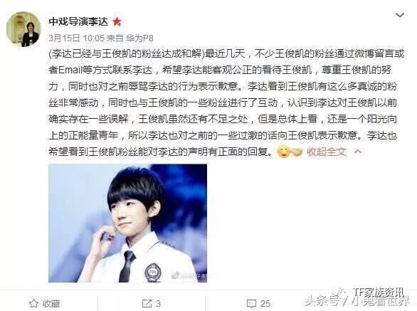 但逗趣的是導演卻疑似不小心轉發到另一位成員王源的微博,而且過幾天又稱讚王俊凱是極有正能量的人,並聲稱自己已和王俊凱達成和解,令人霧裡看花,不知道到底發生什麼事。有網友推測可能是部分失控的粉絲無端替王俊凱招黑,所以才產生這次的事件。