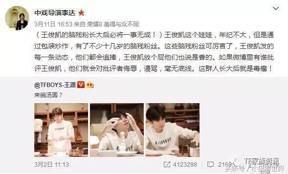 不過隊長王俊凱近來卻無端捲入風波,被中央戲劇學院的導演李達,在其微博痛罵,直指王俊凱透過包裝炒作才紅,還有不少十幾歲的腦殘粉絲,不管王俊凱做什麼都追捧,就連他放屁都會說是香的,如果有人批評王俊凱,這些腦殘粉就會毫無底線的亂謾罵,將來長大會變毒瘤。李達用字激烈,不過若細看其言談,其實導演點出的是粉絲失去理性過度追捧、分不清好壞的狀況。