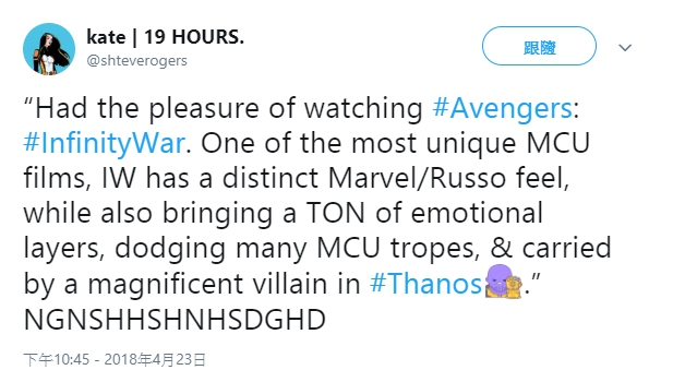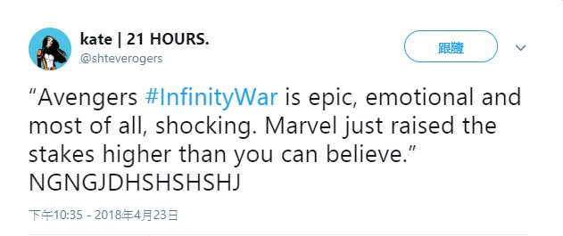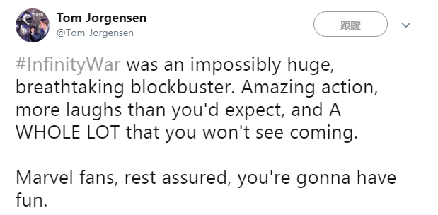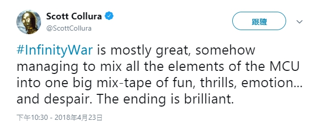▼IGN 電影記者:「《復仇者聯盟 3》大部分都很棒,不知道他們如何將所有漫威電影宇宙的元素都結合成一部有趣、震撼又感動,還有絕望的大合集,結尾非常地傑出。」