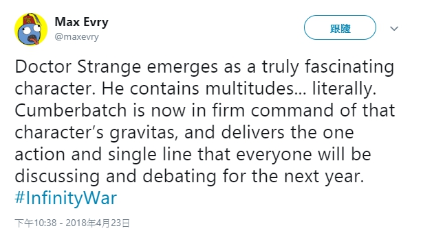 ▼ComingSoon.net 記者則表示:「奇異博士真正的脫癮而出,成為一個迷人的角色,他任務很重....事實上,班奈狄克·康柏拜區已經牢牢掌控了這個角色的份量,同時他貢獻了一場打鬥戲加上一句台詞,就能讓所有人在接下來一年內都為此展開討論和爭辯。」