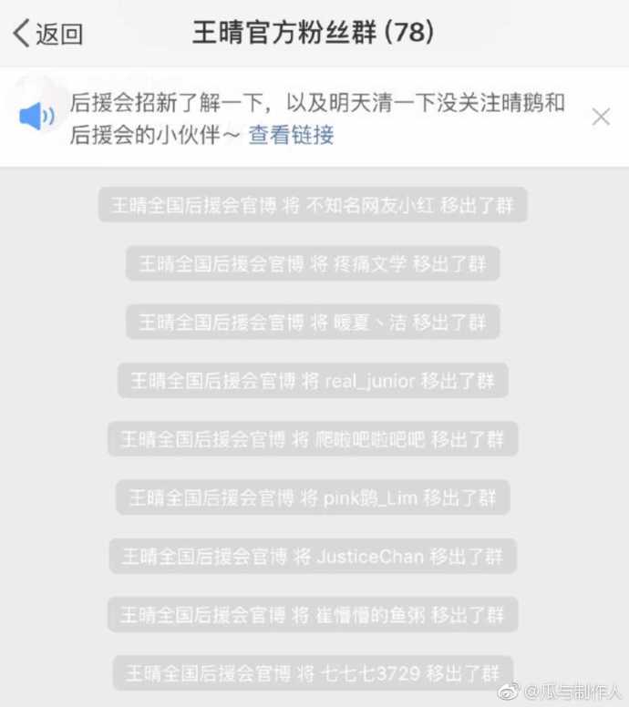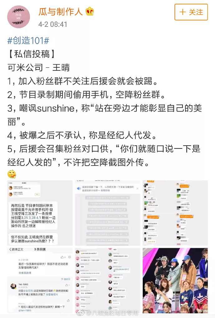 但王晴在微博中被爆料,她違反《創造101》不得使用手機的規定,不僅空降粉絲群,還要求加入粉絲群的粉絲們要關注她的後援會,不關注就會被踢群,消息被踢爆後,又矢口否認,說是經紀人代發的,更要求粉絲們對外只能說「你們就隨口說一下是經紀人發的」不得外流她空降粉絲群的截圖。