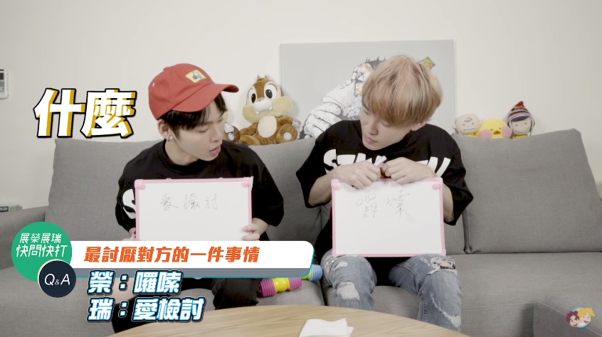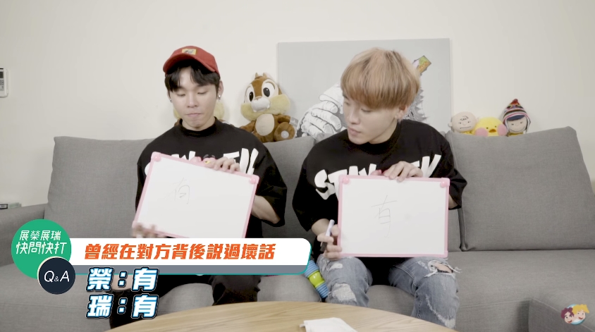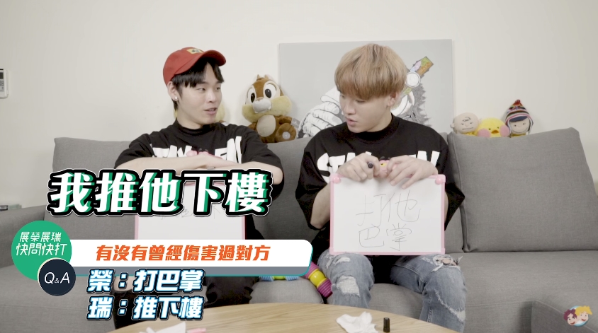 快問快打的問答遊戲中,兩人只要聽到對方的答案覺得「不滿意」或是「不合理」的地方,就可以用軟棒打對方。他們提問的問題包含「曾經在對方背後說過壞話」、「最討厭對方的一件事情」、「誰的異性緣比較好」、「有沒有傷害過對方」等問題,其中還問到一題「希望誰可以當對方的女朋友」展瑞立馬寫出「白癡公主」,而展榮則也立刻回覆「人家就說不可能了」,然後展瑞就反擊爆料「他(展榮)明明就很愛約她出去」展榮便拿起軟棒狂打弟弟「大家朋友不能聚會喔!」。