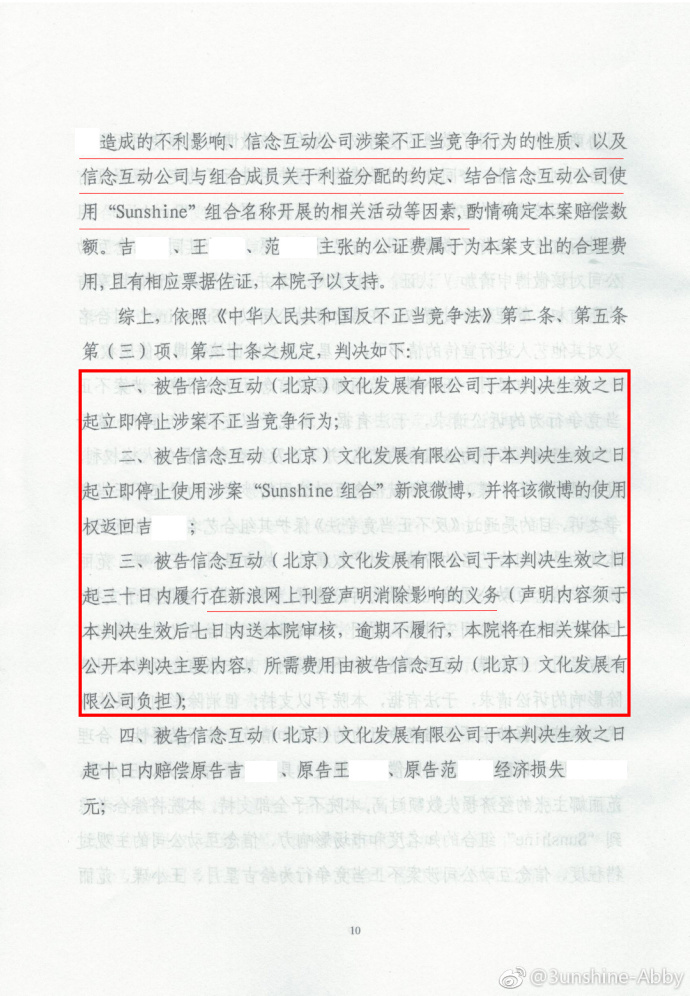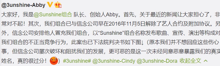 3unshine也立刻於25日晚間發出聲明,拿出法院判決書,表名早已和前經紀公司「信念」解約,並控訴信念利用她們的人氣,仿造出另一個同音女團「sunshine」,和她們惡性競爭。