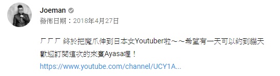 國際化汁妹!「joeman」私約日正妹youtuber不滿足!再發宏願:希望約到「貓天」