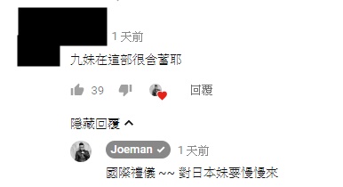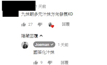 「Joeman」(又稱九妹)是台灣知名youtuber,除了日常的主持工作外,也時常在頻道中分享各種開箱實測,口條清晰不失幽默、影片內容新奇,時常為粉絲謀福利,更常找來正妹好友合作拍片,目前youtube頻道已有超過78萬粉絲訂閱。