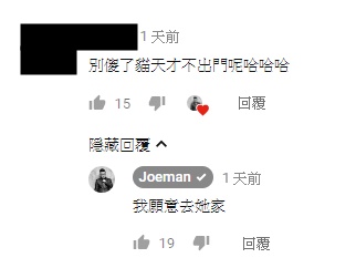 但 Joeman對此似乎仍不滿足,他向粉絲表示「ㄏㄏㄏ 終於把魔爪伸到日本女Youtuber啦~~希望有一天可以約到貓天 」。貓天(ねこてん)是另一名日本著名的youtuber,1996年生,目前youtube頻道有超過79萬人次訂閱,主要以分享日常生活、美食、可愛小物為主,已累積超過5千萬觀看次數,曾1個月內就賺到近90萬日圓(約台幣24萬元),因為對鼻子很自卑,所以會在鼻子上貼OK蹦,即使沒貼OK蹦也會把鼻子擋住,這是她的最大特色。對於Joeman的夢想,也有網友熱心回覆「別傻了貓天才不出門呢哈哈哈」,接著Joeman則痴漢的表示「我願意去她家」,希望未來真的能看到 Joeman跟貓天一起合拍影片囉!