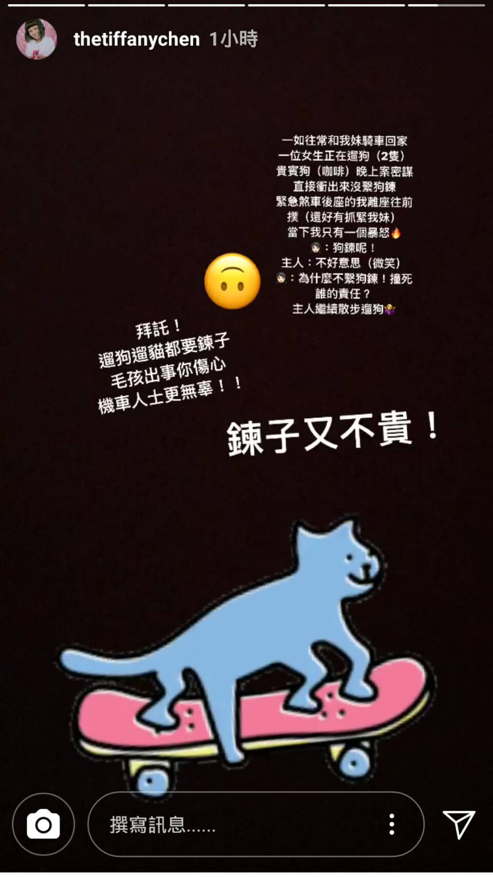 接著彥婷更呼籲大家「拜託!遛狗遛貓都要鍊子,毛小孩出事你傷心,機車人是更無辜,鍊子又不貴!」原來是彥婷遇到了沒有繫上鍊子就帶毛小孩出來散步的主人,無所謂的態度真的很令人火大阿!希望大家外出遛寵物真的要繫上鍊子阿!不僅毛小孩有可能會受傷,機車或汽車騎士為了要閃避毛小孩也是有可能受傷的阿!!