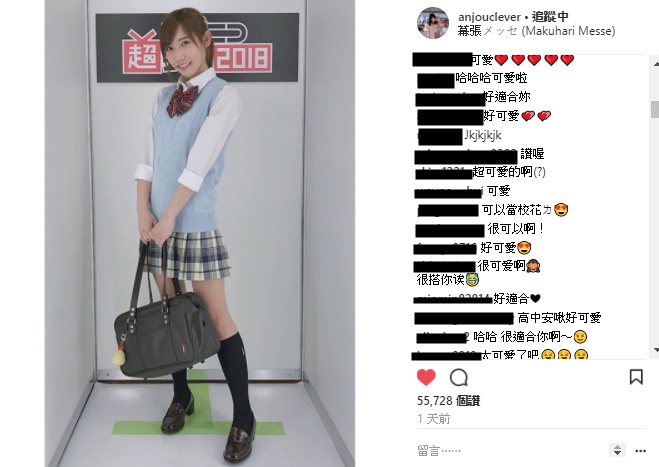 網友們看見也紛紛回應「安啾豪口愛啊啊啊啊啊 」、「萌到炸掉啊啊 」、「安啾超可愛!!!!其實你才17對吧哈哈哈哈 」、「整個動漫女主角 」、「毫無違和感阿阿 」、「最高!!!!!屌打日本JK!!!!! 」、「安啾腿好細(羨慕~ 」、「現在也很難找到這麼漂亮又可愛的JK了~安啾萬歲~~ 」、「這不行,太可愛了,整個畫面都是粉紅色的 」、「安啾你好瘦喔!穿起來超好看的 」、「完全就像個日本妹子(・´з`・) 」、「覺得安啾很可愛,是所有youtuber當中第一個注意到的youtuber! 」、「超級駕馭啊」、「好可愛喔,跟動漫的角色一模一樣」、「哪間學校的校花啊?可愛到母湯! 」、「看樣子應該是校花哦 」、「超級超級可愛,根本校花! 」、「超適合的!!漫畫女主是妳 」。