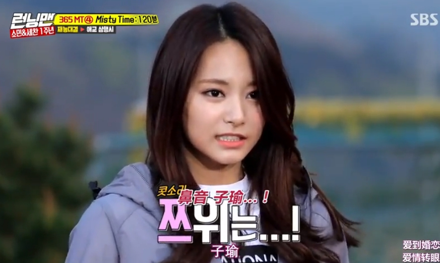 行程滿檔的TWICE近期也抽空出演韓國人氣綜藝節目「Running man」,和主持人組對PK才藝,而第一項要PK的就是用三行詩撒嬌。而子瑜的撒嬌方式令眾人跌破眼鏡,不僅用自己的名字做二行詩,還用「病態感撒嬌」用娃娃音向眾人說著:「子瑜胃疼啦~~」讓現場眾人笑翻。
