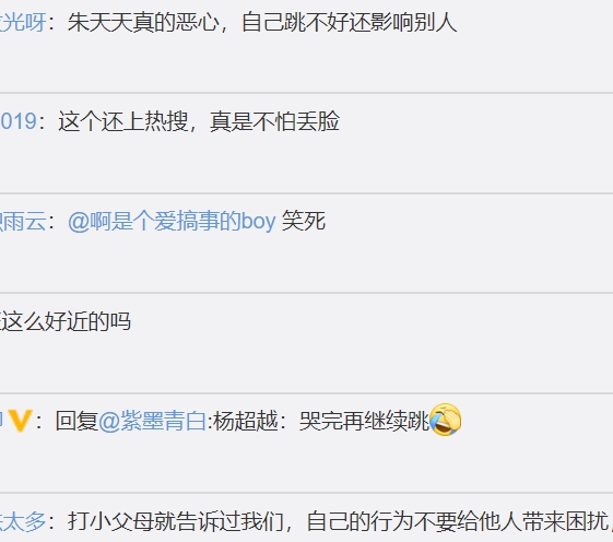 朱天天的行為也為自己招黑,許多觀眾看完紛紛在微博上大罵她影響別人的這種行為非常差勁。
