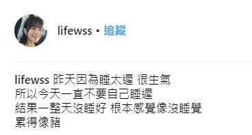 舒森30日於個人IG更新動態,內容寫著:「昨天因為睡太遲,很生氣,所以今天一直不要自己睡遲,結果一整天沒睡好 根本感覺像沒睡覺,累得像豬。」還配上一張豬的照片。