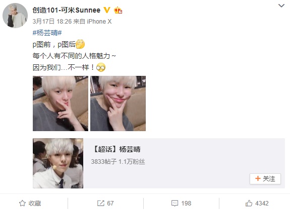 《創造101》帥氣練習生Sunnee自招P圖前後差很大 網笑瘋:您的偶包去了哪裡