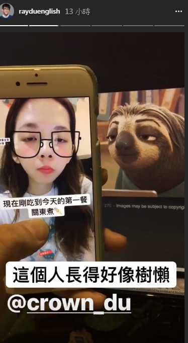 不過沒多久後,他的哥哥卻發在IG的限時動態中拿出剛剛滴妹的照片對比迪士尼電影《動物方程式》中的樹懶,寫下「這個人長得好像樹懶喔!」還特別tag妹妹滴妹,超級會吐槽妹妹,不過這樣一對比,好像真的很像耶哈哈!